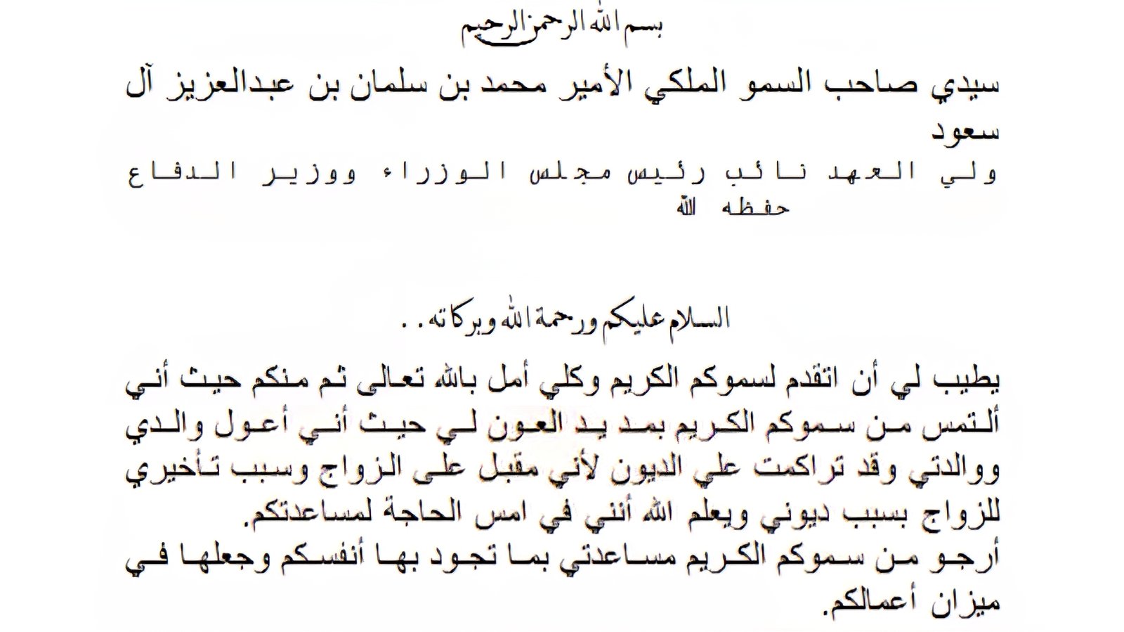 الديوان الملكي | مساعدة مالية مباشرة | برقية أو خطاب رسمي |