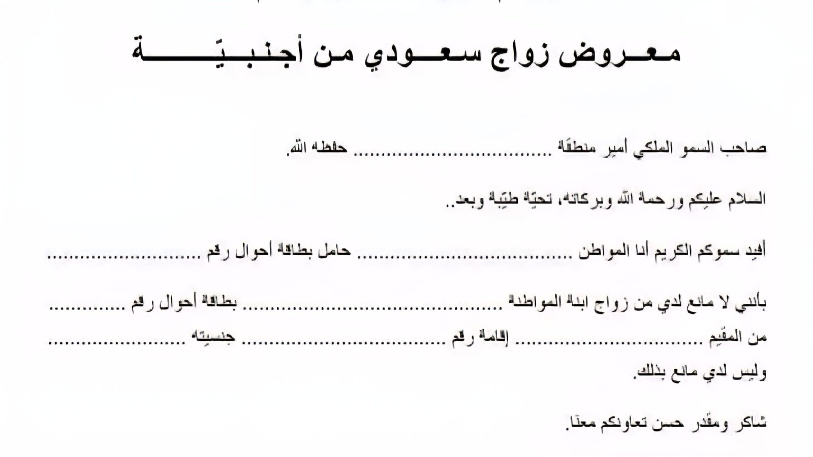 “إلى سعادة المسؤول المحترم… أتقدم لسيادتكم بطلب الموافقة على زواجي من (اسم الطرف الآخر) جنسية (الجنسية)، وذلك وفق الأنظمة والتعليمات المرعية…”
